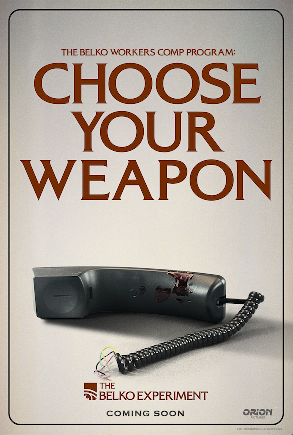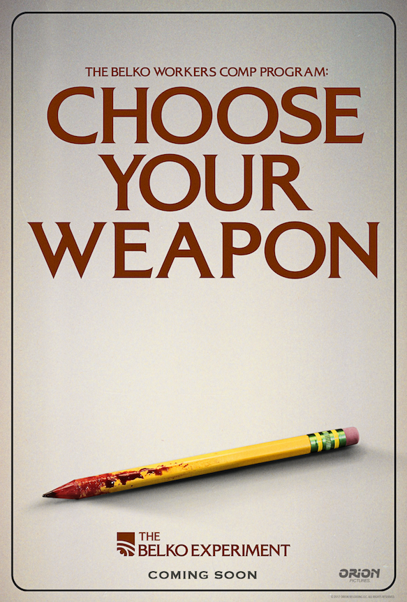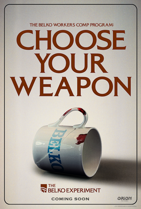 A pencil? The sellotape dispenser? The telephone? Or a simple china cup? That’s the options for a weapon of choice in the brilliant new posters released for the upcoming The Belko Experiment.